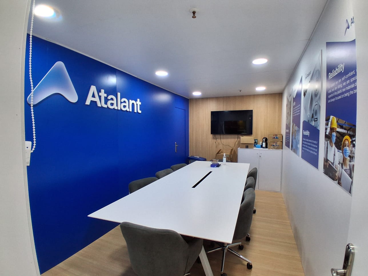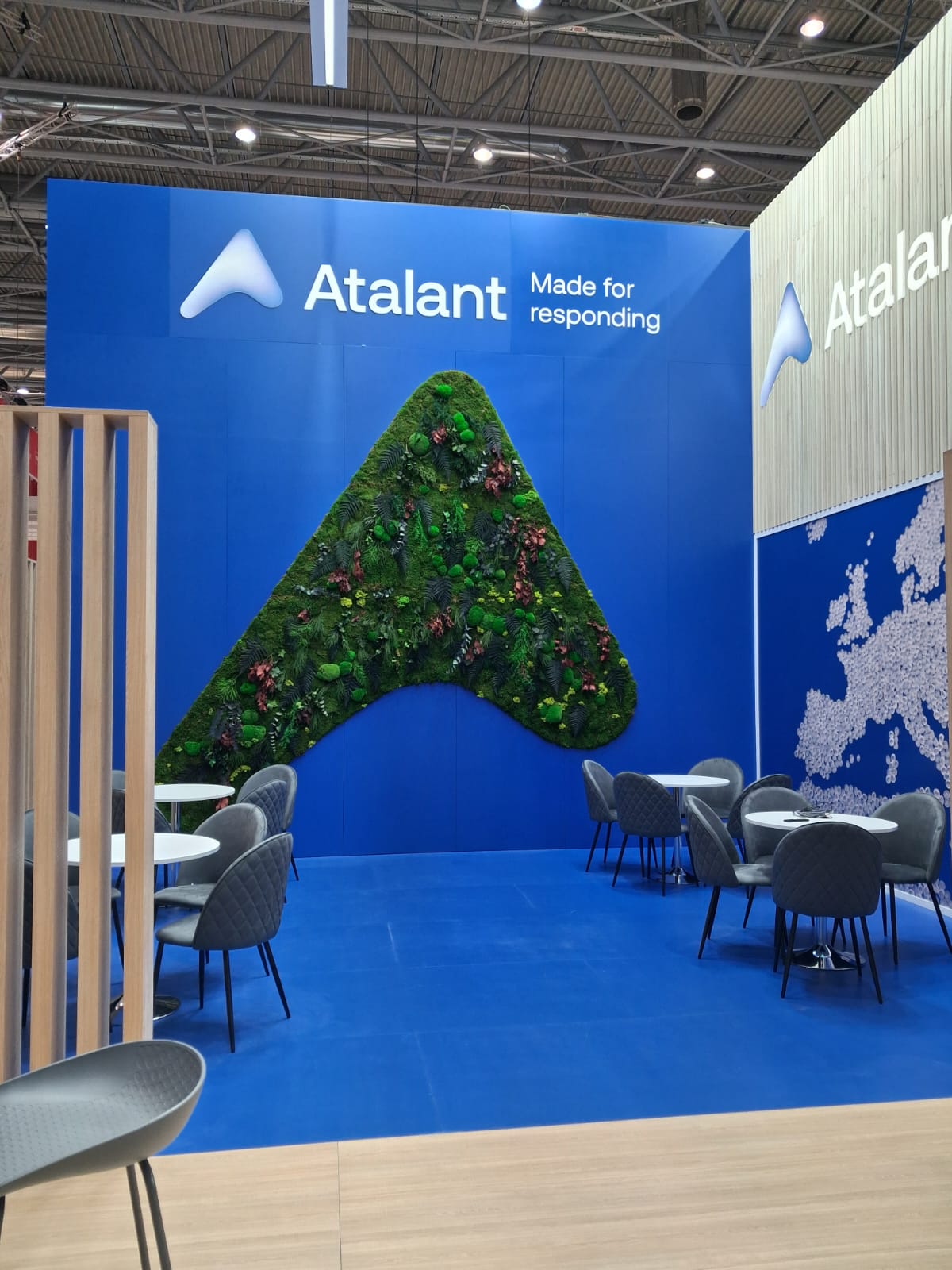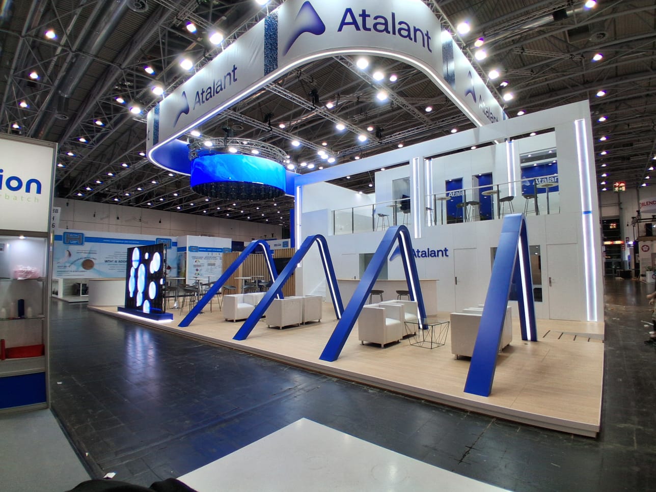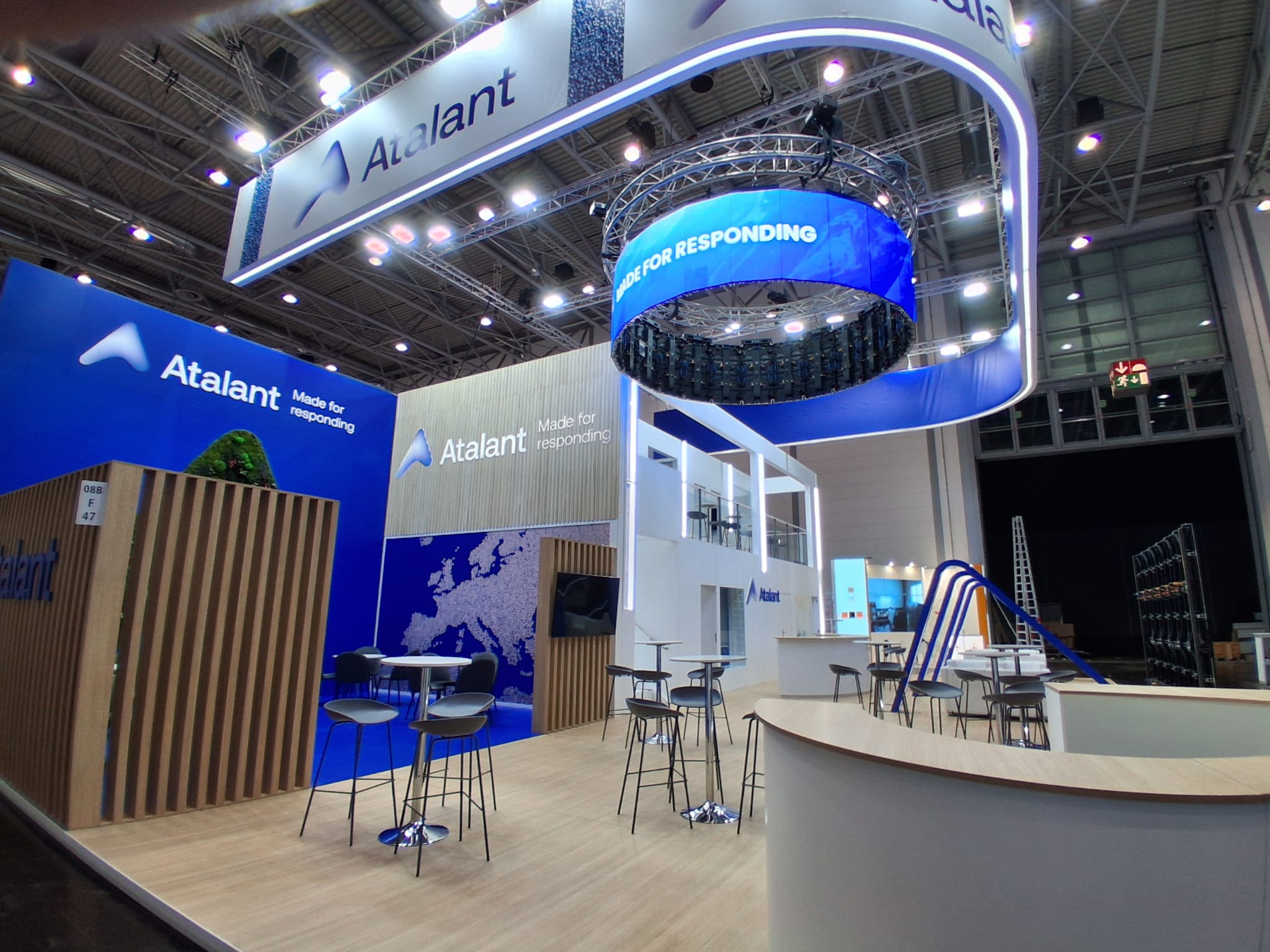 Para Atalant en K Düsseldorf desarrollamos un stand corporativo tecnológico de dos niveles, concebido como un hub de marca y negocio que combina impacto visual, fluidez de recorrido y máxima capacidad de reunión. La propuesta se reconoce a distancia por una gran cartela suspendida y un banner circular con pantallas LED, que envuelven el espacio con mensaje dinámico y refuerzan el posicionamiento “Made for responding”, mientras el interior se organiza en un layout abierto con áreas de networking, demostración y hospitalidad.
