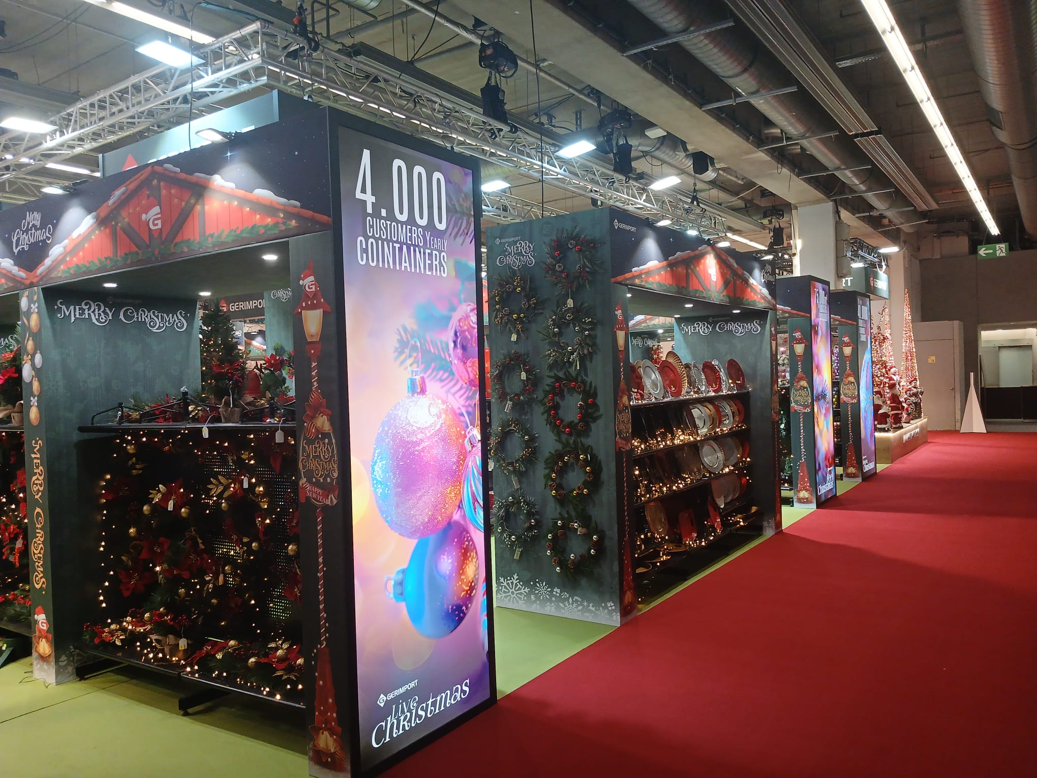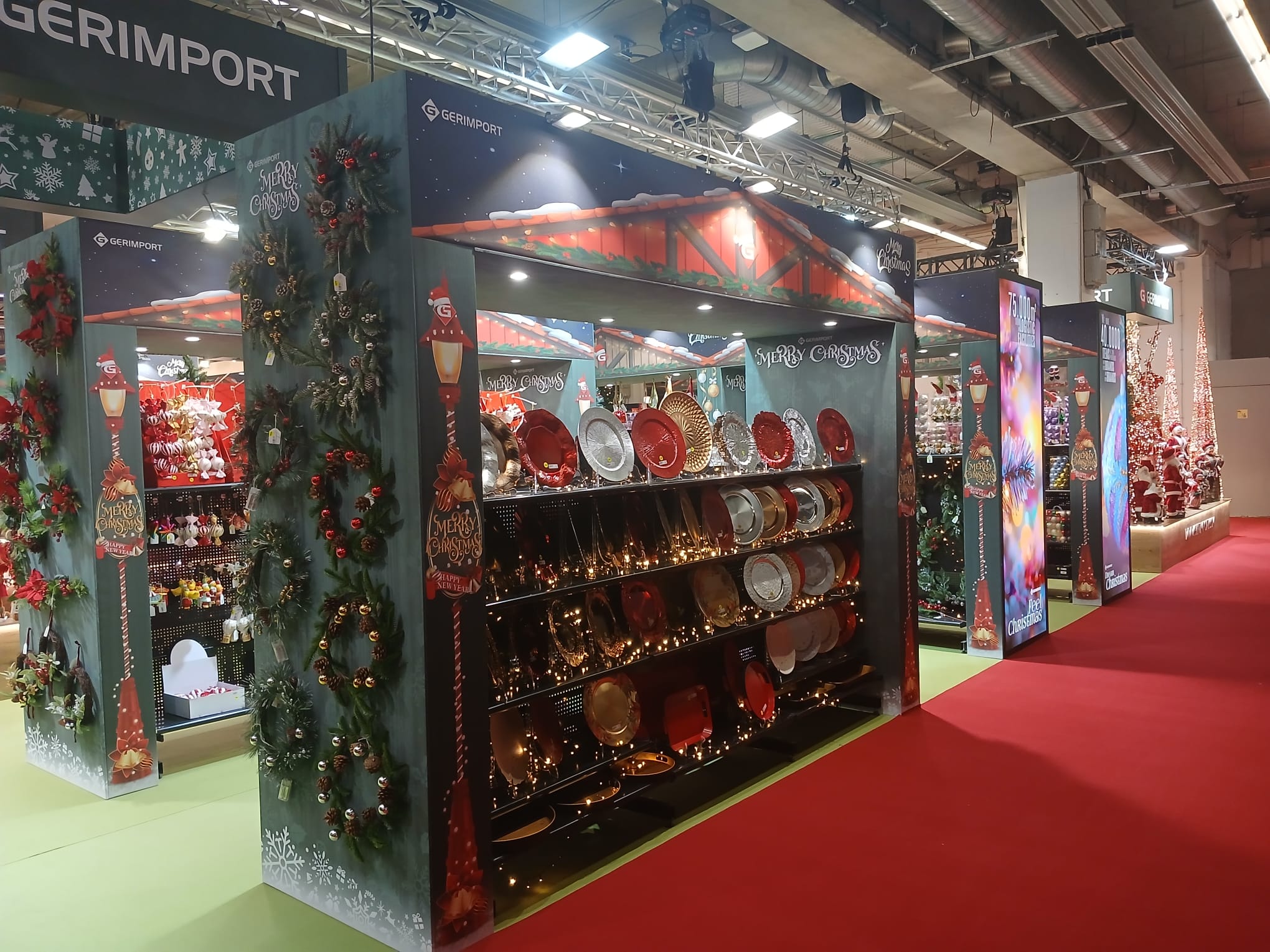 Para Christmasworld en Frankfurt, diseñamos para Gerimport un espacio temático que traduce el universo navideño a una arquitectura ferial funcional y altamente visible. El concepto se construye como un “Christmas Village” contemporáneo: una retícula de accesos tipo pórtico que genera un recorrido intuitivo entre “calles” de producto, con un fuerte impacto de marca en altura gracias a la estructura superior de truss y las coronas perimetrales rotuladas GERIMPORT, visibles desde múltiples ángulos del pabellón.