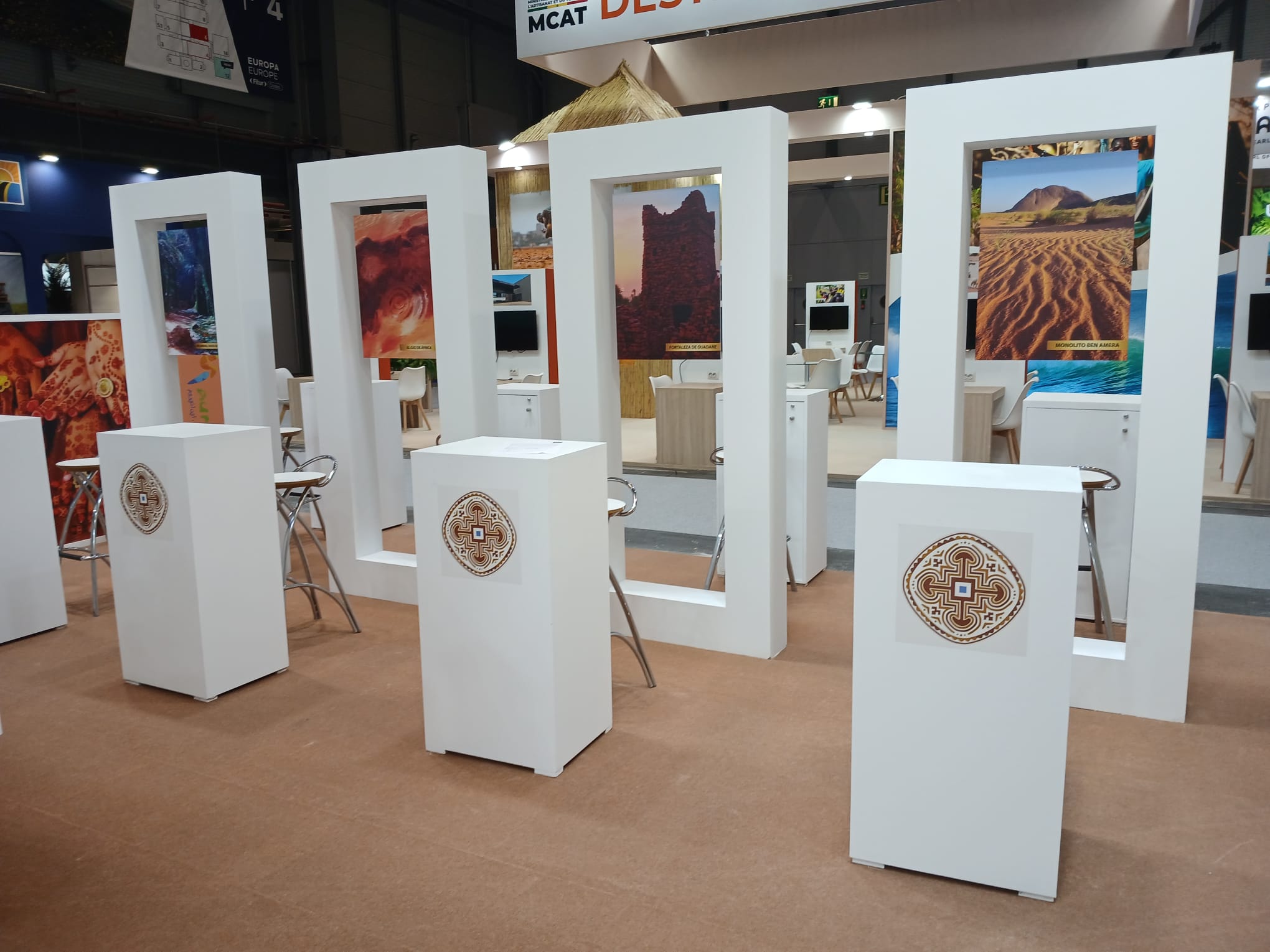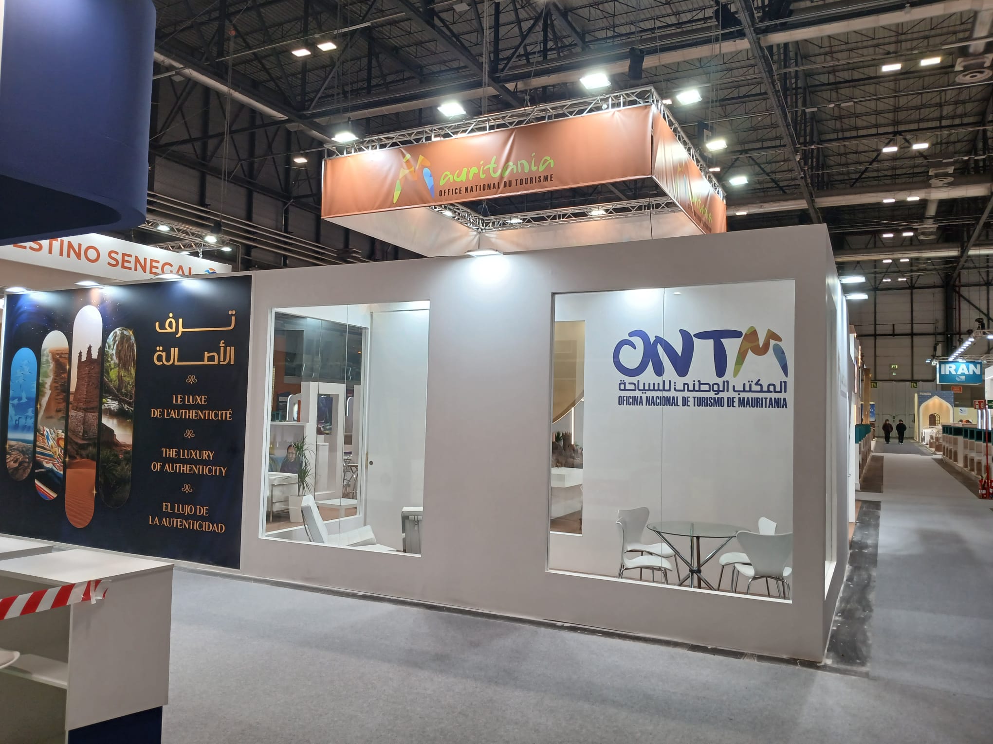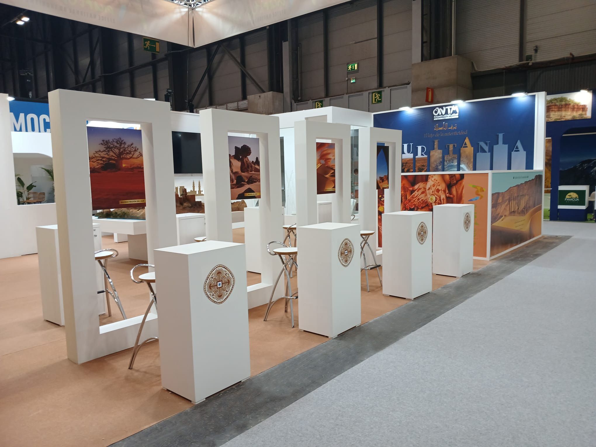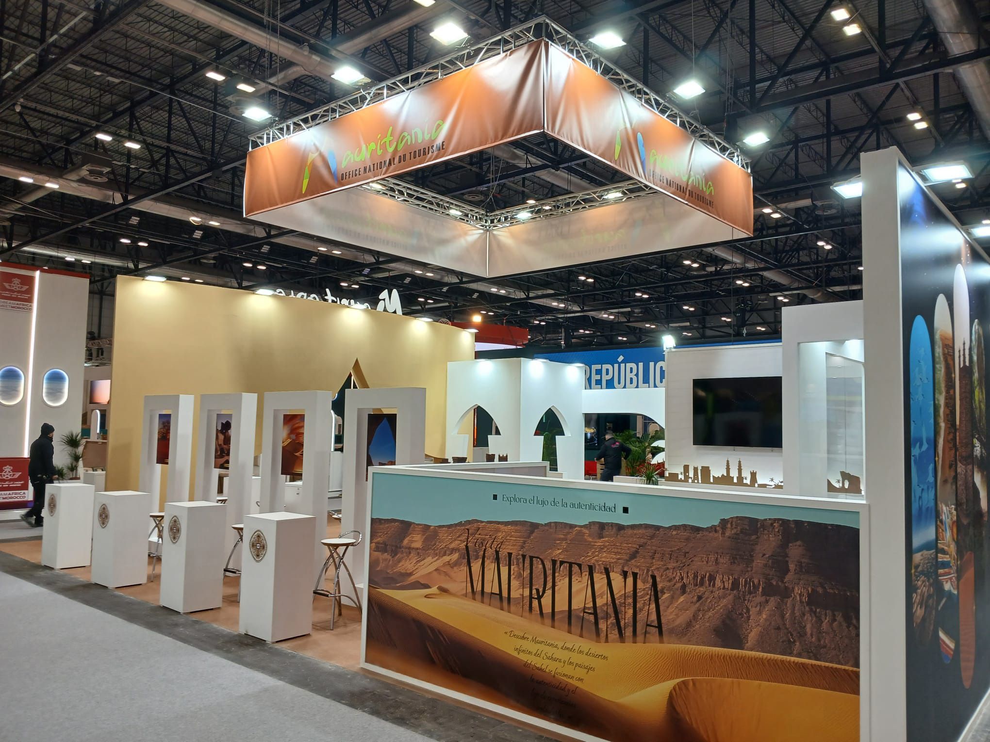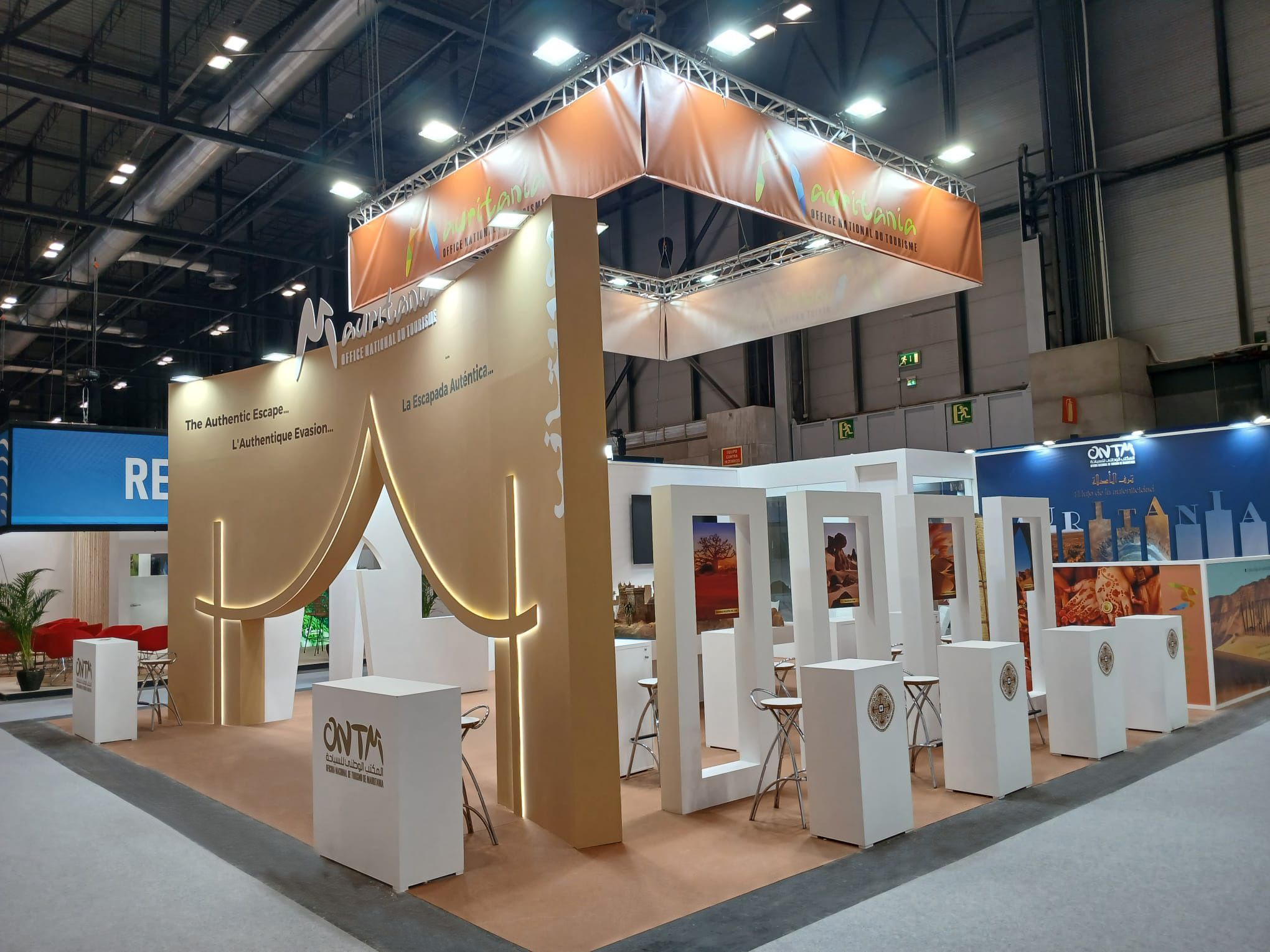 Para la Oficina Nacional de Turismo de Mauritania (ONTM) en FITUR Madrid, desarrollamos un espacio que traduce el destino en arquitectura y experiencia: una propuesta limpia, luminosa y contemporánea que combina iconografía local (arcos y siluetas inspiradas en la arquitectura tradicional) con una narrativa visual centrada en desierto, cultura y autenticidad. El stand se estructura alrededor de un pórtico-escultura de gran impacto una “gran tienda” abstracta con líneas de luz integradas que actúa como hito de atracción desde pasillo y como puerta simbólica al viaje.