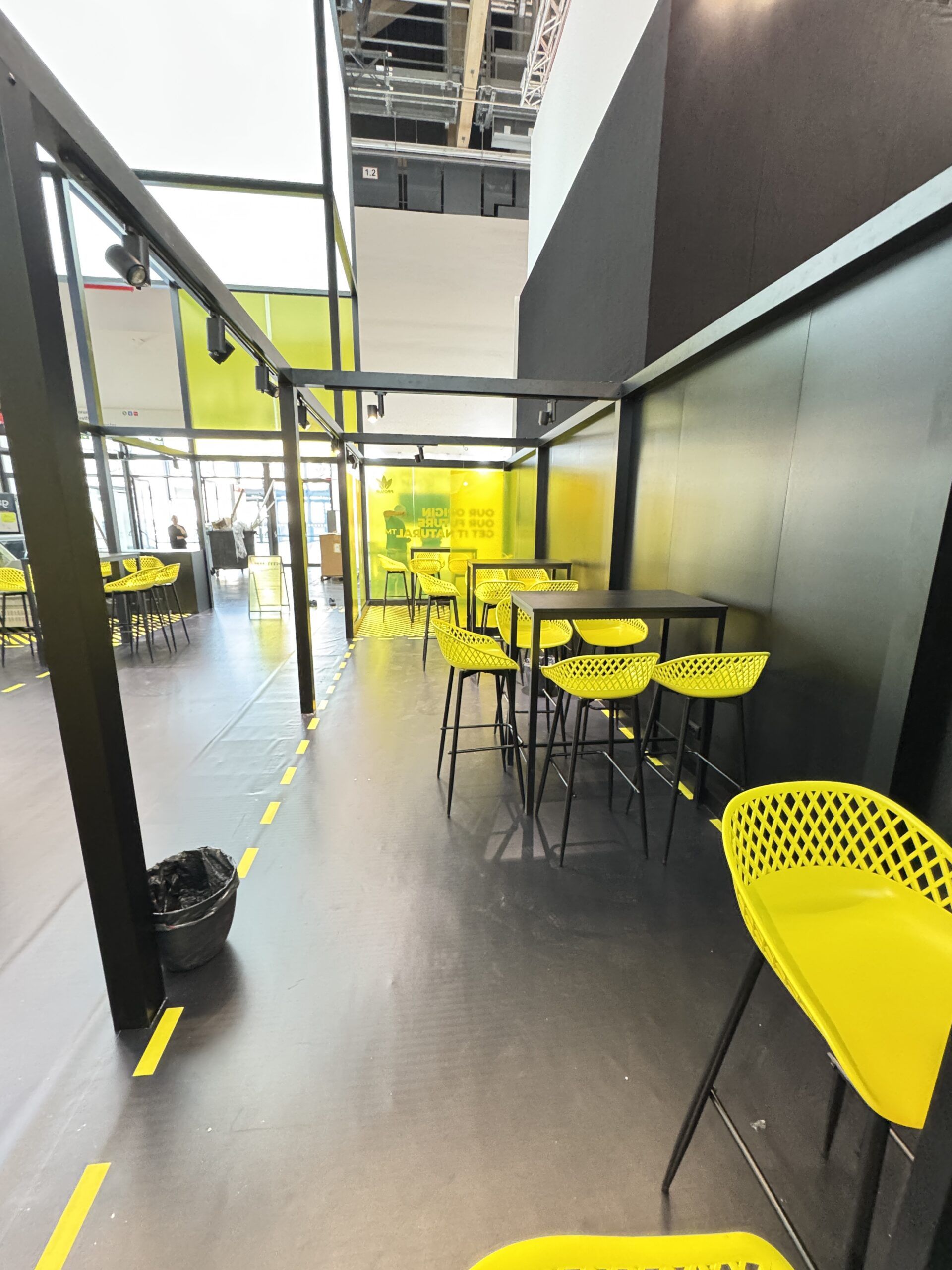 El layout integra barra operativa, mostrador, despacho acristalado para reuniones ágiles y almacén equipado (encimera, estanterías, isla, frigoríficos, fregadero y ropero), asegurando un flujo de trabajo eficiente entre hospitality, producto y equipo comercial. La medianera combina carpintería lacada hasta 2,50 m con tela negra hasta 5 m para control acústico y visual, mientras la cortina de PVC amarillo en zona de barra suma ritmo y guiado de circulación.