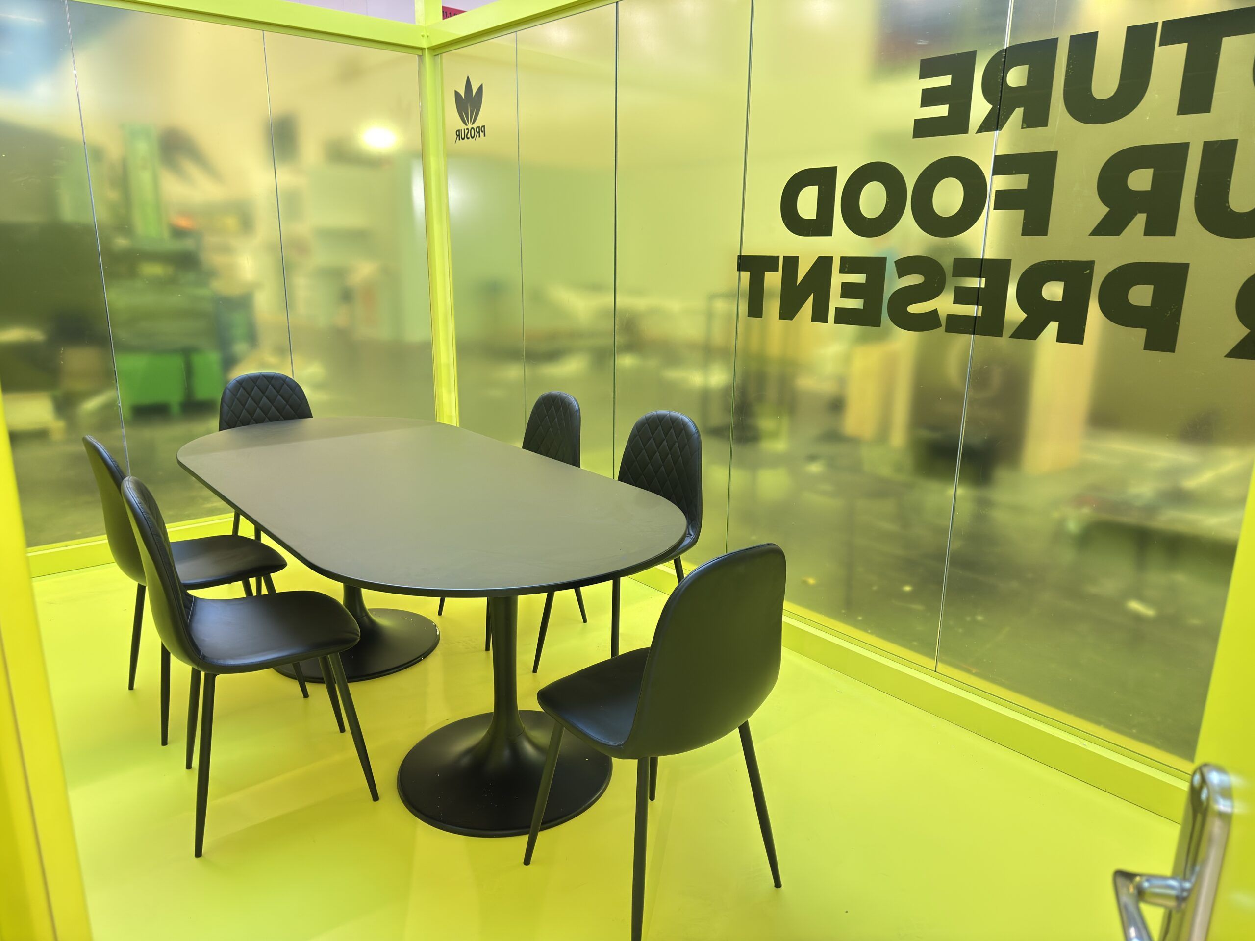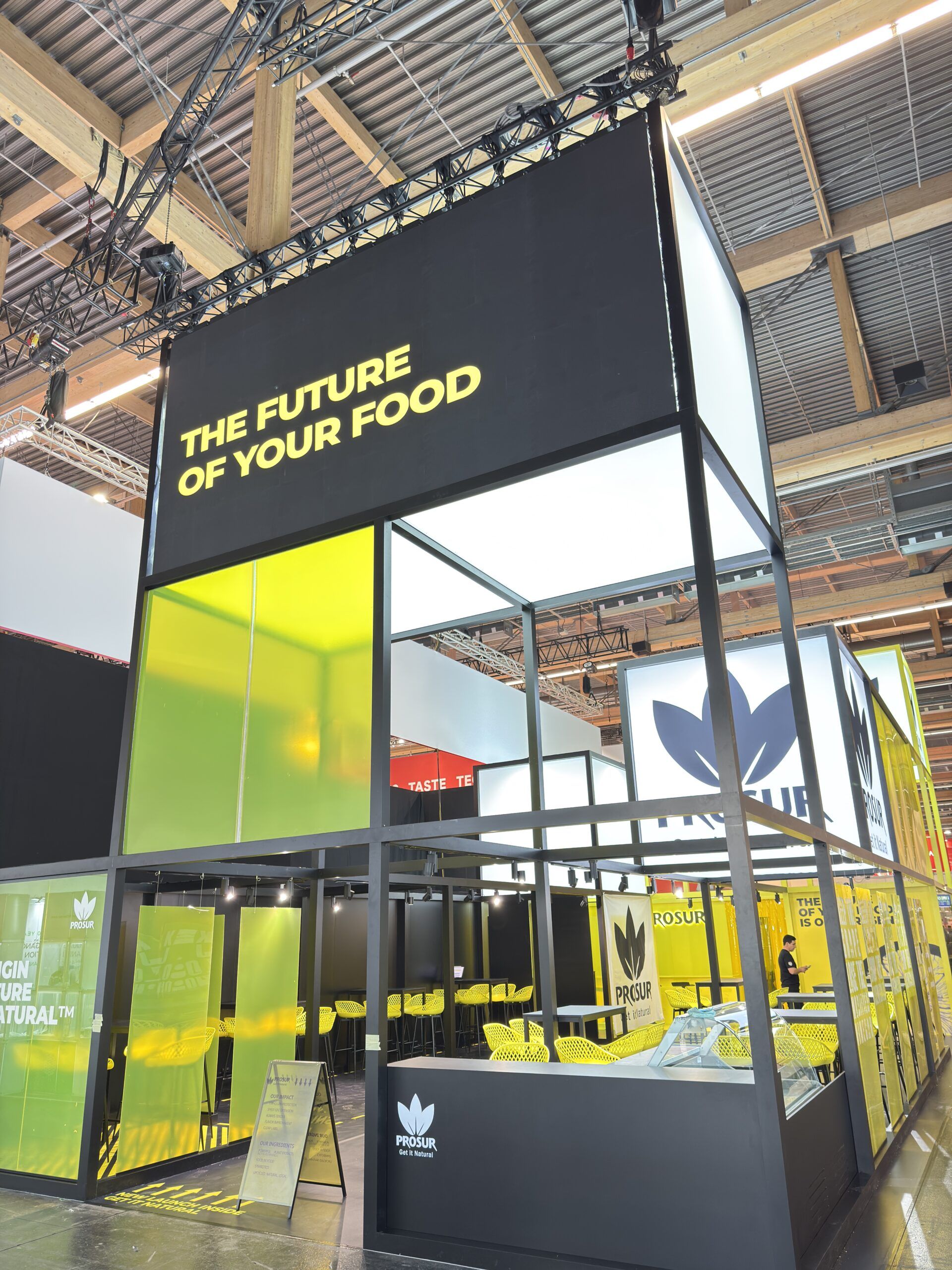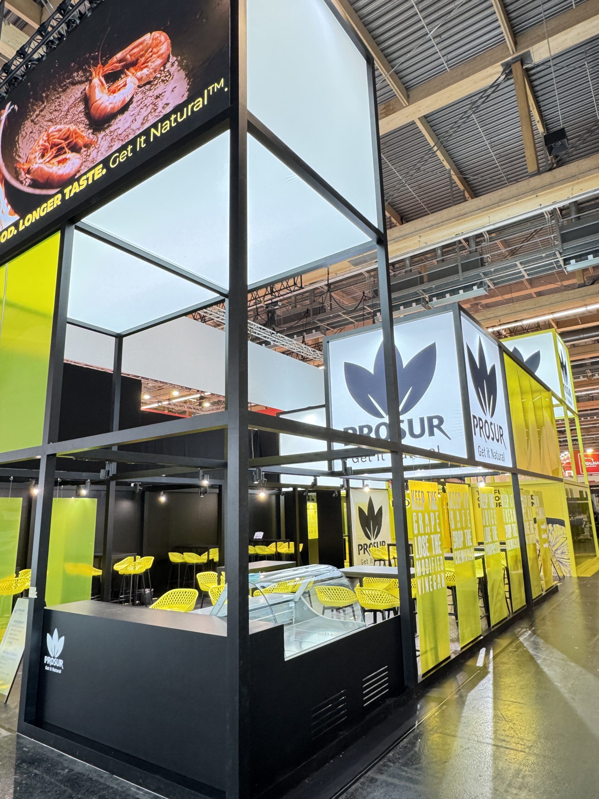 En el marco de IFFA Frankfurt, diseñamos para Prosur un espacio que convierte su claim “Get it Natural” en experiencia tangible. La arquitectura parte de una retícula metálica barnizada en negro y amarillo que ordena recorridos, zonas de degustación y meeting points, y se viste con metacrilatos portando vinilo amarillo semitransparente. Cuatro cubos se resuelven como cajas de luz retroiluminadas por cinco caras (laterales y base), generando un faro visual continuo hacia pasillo y reforzando la narrativa de marca.